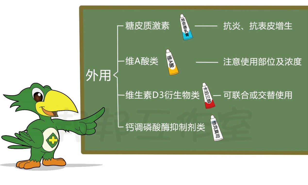 其中外用药物又分为激素类、维A酸类、维生素D3衍生物类、钙调磷酸酶抑制剂类等。激素类如地奈德乳膏、哈西奈德乳膏或溶液、卤米松乳膏、丁酸氢化可的松乳膏等。