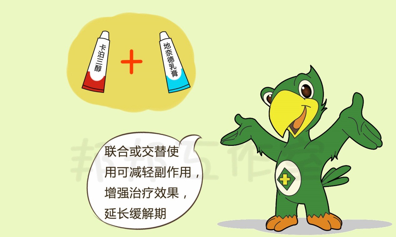 维生素D3衍生物类有卡泊三醇、他卡西醇等。卡泊三醇软膏由于是非激素类外用药物,与地奈德乳膏联合或交替使用治疗银屑病可减轻其激素副作用,增强治疗效果,延长缓解期。