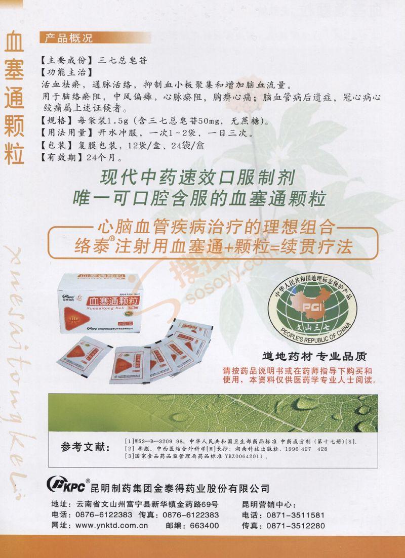 【功能主治】活血祛瘀,通脉活络,抑制血小板聚集和增加脑血流量。用于脑路瘀阻,中风偏瘫,心脉瘀阻,胸痹心痛;脑血管后遗症、冠心病心绞痛属上述证候者。【规【规格】每袋装1.5g(含三七总皂甙50mg,无蔗糖)