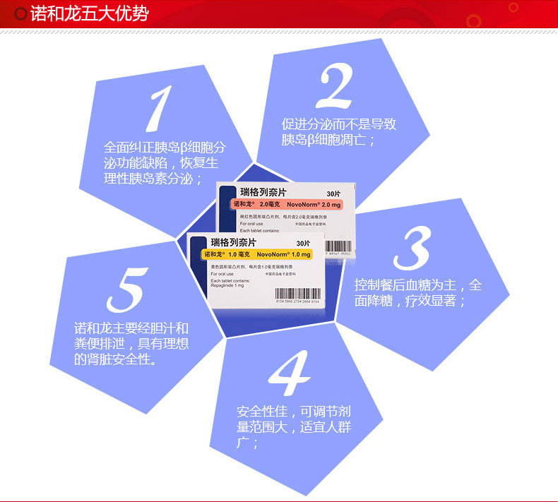 【适应症/功能主治】 用于饮食控制、减轻体重及运动锻炼不能有效控制其高血糖的2型糖尿病(非胰岛素依赖型)患者。当单独使用二甲双胍不能有效控制其高血糖时,瑞格列奈片可与二甲双胍合用。治疗应从饮食控制和运动锻炼降低餐时的辅助治疗开始。