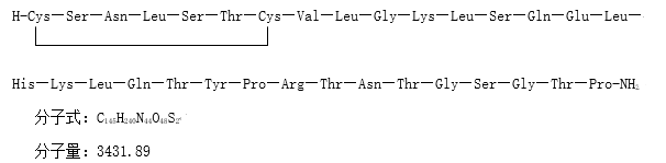 化学名称:(1,7 —二硫环)—半胱氨酰—丝氨酰—天冬酰胺酰—亮氨酰—丝氨酰—苏氨酰—半胱氨酰—缬氨酰—亮氨酰—甘氨酰—赖氨酰—亮氨酰—丝氨酰—谷胺酰氨酰—谷胺酰—亮氨酰—组氨酰—赖氨酰—亮氨酰—谷胺酰氨酰—苏氨酰—酪氨酰—脯氨酰—精氨酰—苏氨酰—天冬酰胺酰—苏氨酰—甘氨酰—丝氨酰—甘氨酰—苏氨酰—脯氨酰胺。