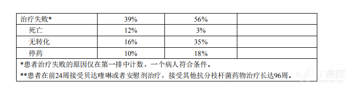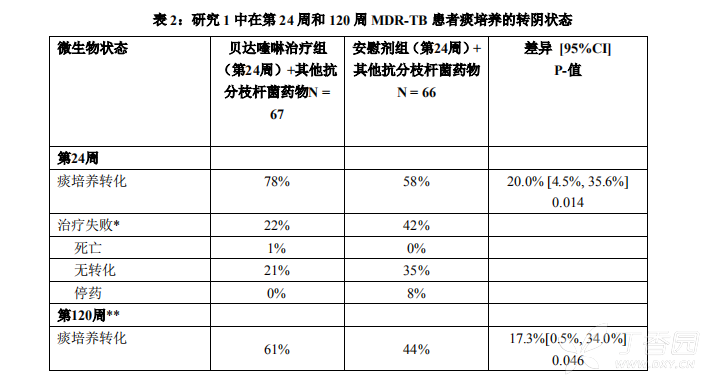 贝达喹啉治疗组的痰培养转阴中位时间为 83 天,安慰剂组为 125 天。表 2 显示的是第 24 周和 120 周时痰培养转化的患者的比例。