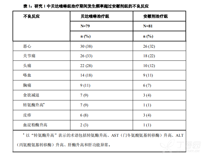 本品的药物不良反应信息来源于 335 例按指定剂量用药 8 周(研究 2)和 24 周(研究 1 和 3)的患者安全性数据集。研究 1 和 2 是在新诊断的耐多药肺结核(MDR-TB)患者中进行的随机、双盲、安慰剂对照试验。在两个治疗组中,患者接受本品或安慰剂的同时联合应用其他治疗 MDR-TB 的药物。