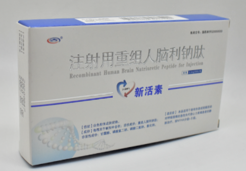 【用法用量】采用按负荷剂量静脉推注本品,随后按维持剂量进行静脉滴注。推荐的常用剂量,本品首先以1.5μg /kg静脉冲击后,以0.0075μg /kg/min的速度连续静脉滴注。剂量范围,负荷剂量:1.5-2ug/kg,维持剂量速率:0.0075-0.01ug/kg/min(建议开始静脉滴注的维持剂量速率为:0.0075ug/kg/min)。调整增加滴注给药速率需谨慎。用药方式,本品国内临床试验采用连续静脉滴注24小时的给药方式。剂量调整的最佳方法,在给药期间应密切监视血压变化。如果在给药期间发生低血压,则应降低给药剂量或停止给药并开始其它恢复血压的措施(如输液、改变体位等)。由于重组人脑利钠肽引起的低血压作用的持续时间可能较长(平均2.2小时),所以在重新给药开始前,必须设置一个观察期。静脉用药液的制备,不得与其他厂家同类品混用。尽量使用同批号产品。从装有250ml稀释液的输液袋中分3次抽取稀释液(推荐稀释液:5%葡萄糖注射液、0.9%生理盐水、含5%葡萄糖和0.45%NaCl注射液、含5%葡萄糖和0.2%NaCl注射液),每次抽出1.5ml,分别加入到3个重组人脑利钠肽的制剂瓶中(若患者的体重比较轻,没有必要同时稀释三支药物时,可以采用:从装有100 ml稀释液的输液袋中抽取稀释液16.7ml弃用,并在从该输液袋中抽出1.5ml,加入到其中的一支重组人脑利钠肽的制剂瓶中,若需要第二支药品时,再按照上述方法进行稀释)。勿震摇药瓶,轻轻地摇动药瓶,使瓶中包括瓶塞在内的所有部分都能与稀释液接触,保证药物充分溶解,只可使用清澈无色的溶液。从3个药瓶中分别抽出溶解后的重组人脑利钠肽药液,全部注入到容量为250ml的静脉输液袋中,此时在输液袋中本品的药物浓度大约为6μg/mL。反复翻转输液袋,使药物充分混匀(对采用100ml输液袋的体重较轻患者,从已经初步稀释的一个药瓶中抽出溶解后的重组人脑利钠肽药液,全部注入到上述已经弃用16.7ml稀释液、规格为100ml的静脉输液袋中,此时在输液袋中本品的药物浓度大约为6μg/mL。反复翻转输液袋,使药物充分混匀)。在患者建立静脉通路进行静脉推注和滴注之前,准备一个25mL的输液针筒。按照上述方法准备好输液袋后,抽取给予静脉冲击量的重组人脑利钠肽药液(见下表),以大约60秒的时间将输液针筒中的药液通过静脉推注入血管,然后以0.0075mL/kg/hr的速率静脉滴注本品,即滴注的剂量为0.0075μg /kg/min。换算准确的给予静脉冲击的药液体积及0.0075μg /kg/min的静脉滴注的速率,可参考以下的公式(或参照以下的给药剂量表格):静脉冲击剂量(mL)=受试者体重(kg)÷4,静脉滴注速率(mL/hr)=0.075×受试者体重(kg),按体重调节rhBNP的静脉冲击剂量和静脉滴注速率,(负荷剂量为1.5μg/kg,静滴剂量为0.0075μg/kg/min),50kg 冲击剂量体积12.5ml,静滴速率3.75ml/hr,60kg ,冲击剂量体积15.0ml, 静滴速率4.5ml/hr,70kg ,冲击剂量体积17.5ml, 静滴速率5.25ml/hr,80kg,冲击剂量体积20.0ml, 静滴速率6.0ml/hr,90kg,冲击剂量体积22.5ml, 静滴速率6.75ml/hr,100kg,冲击剂量体积25ml, 静滴速率7.5ml/hr,110kg,冲击剂量体积27.5ml, 静滴速率8.25ml/hr。药物配制后的稳定性,由于药物中不含防腐剂,必须在24小时内使用溶解后的药液。无论任何情况下,在使用非胃肠道途径的药品之前,应该肉眼观察药液中是否存在微粒、变色等情况。溶解后的本品,无论在室温(20-25°C)或在冷藏(2-8°C)条件下的最长放置时间均不得超过24小时。