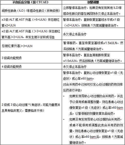 间质性肺病(ILD)/非感染性肺炎:本品临床试验中已报告间质性肺病/非感染性肺炎病例(参见【不良反应】)。应监测患者是否出现提示有非感染性肺炎的肺部症状。确诊患有间质性肺病/非感染性肺炎的患者应立即中断本品治疗,如果没有发现其他间质性肺病/非感染性肺炎的潜在病因,则应永久停药(参见【用法用量】)。