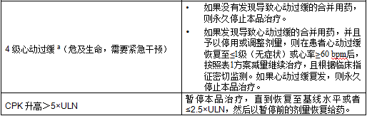 心动过缓:本品治疗可发生症状性心动过缓(参见【不良反应】)。应根据临床指征监测心率和血压。如果发生无症状心动过缓,则无需调整剂量(参见【用法用量】)。如果患者发生症状性心动过缓或危及生命的事件,应对合并用药中已知引发心动过缓的药物以及降压药进行评估,并按表2所述调整本品治疗的剂量(参见【用法用量】和【药物相互作用】)。