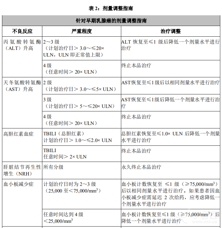 在mBC临床试验中,接受本品治疗的患者中血小板减少症或血小板计数减少的发生率为24.9%,这两种事件也是最常见的导致治疗中止的不良反应(2.6%)。在eBC临床研究中,接受本品治疗的患者中28.5%的患者报告血小板减少症,无论是在所有分级的不良反应中还是≥3级不良反应中,血小板减少症均为最常见的不良反应,也是最常见的导致治疗中止(4.2%)、剂量中断和剂量下调的不良反应。多数患者发生1级或2级事件(≥50,000/mm3),第8天时达到最低值,通常在既定的下一次给药时改善至0级或1级(≥75,000/mm3)。在临床研究中,亚裔患者血小板减少症的发生率和严重程度更高。不考虑人种的情况下,接受本品治疗的mBC患者中3级或4级事件(<50,000/mm3)的发生率为8.7%,eBC患者中为5.7%。因血小板减少症进行的剂量调整信息见【用法用量】和【注意事项】。