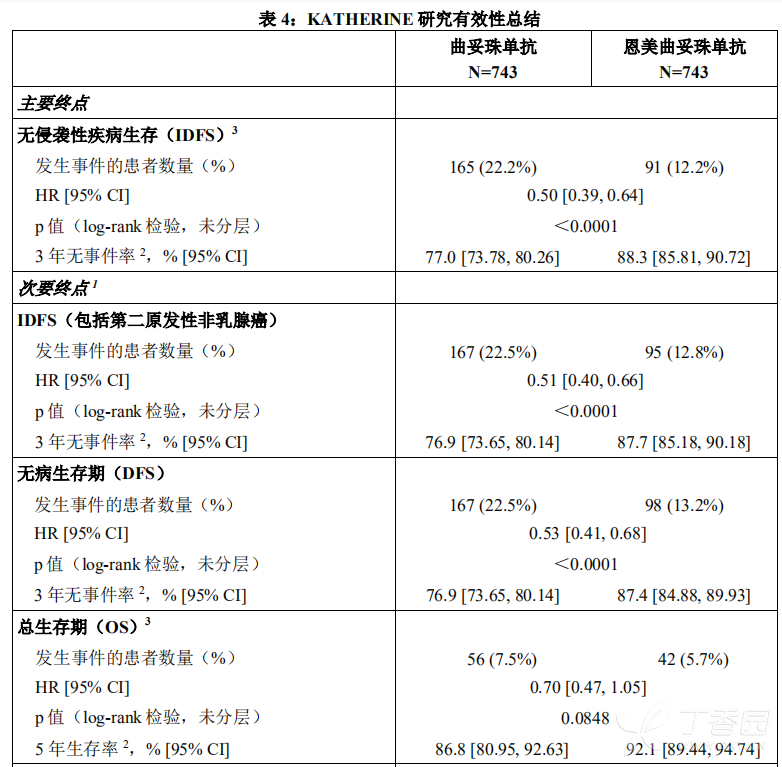 表3是来自晚期乳腺癌(mBC)研究(n=1871;本品的中位治疗周期数为10)和早期乳腺癌(eBC)KATHERINE研究(n=740;中位治疗周期数为14)中总体治疗阶段的汇总数据。
