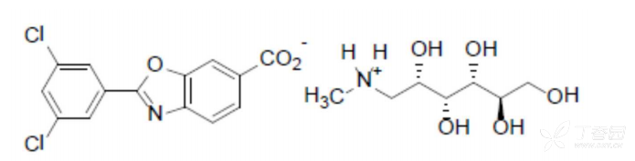 化学名称:2-(3,5-二氯苯基)-1,3-苯并噁唑-6-羧酸单(1-脱氧-1-甲氨基-D-葡萄糖醇)