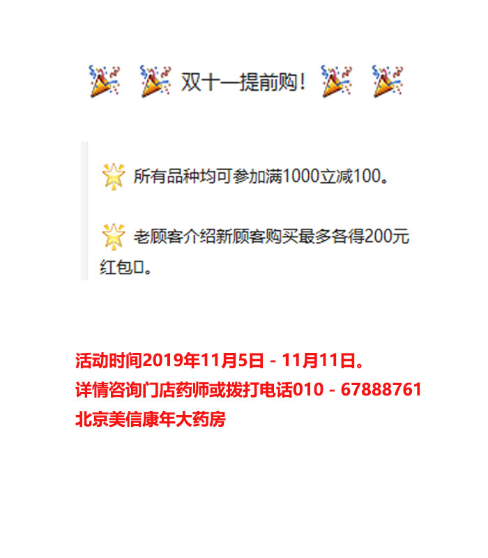 双十一提前购!北京美信康年所有药品均可参加满1000立减100优惠活动