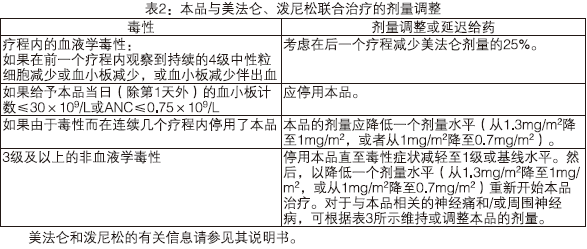 当发生3级非血液学的或任何4级血液学的毒性(不包括下面讨论的神经病变)时,应暂停本品治疗。一旦毒性症状的到缓解,可以重新开始本品的治疗,剂量减少25%(例如:1.3mg/m2降低到1.0mg/m2;1.0mg/m2降低到0.7mg/m2)。如果患者发生与本品治疗有关的神经痛或周围感觉神经病变,建议按下表推荐的调整剂量进行治疗,主治医生应根据患者实际病情选择合适的剂量调整方案。如果患者本身患有严重的神经病变,只有权衡利弊后方可使用本品。
