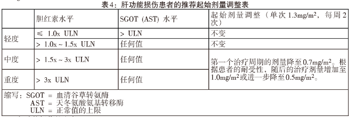 轻度肝功能损害患者不需要调整起始剂量并应按推荐剂量治疗。中重度肝功能损害患者使用本品的起始剂量应降为0.7mg/m2,根据患者第一个周期的耐受性,随后的治疗剂量增加至1.0mg/m2或进一步降至0.5mg/m2。