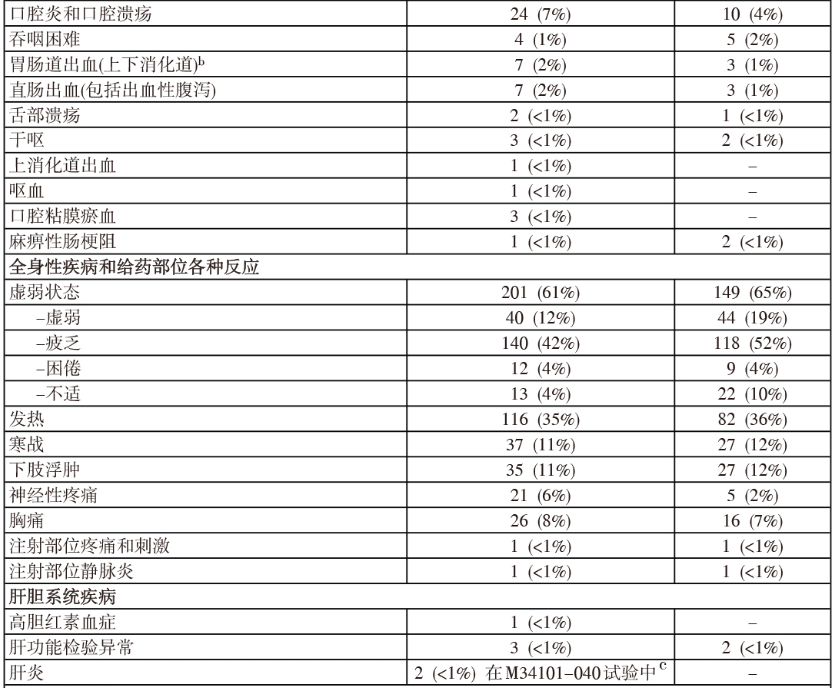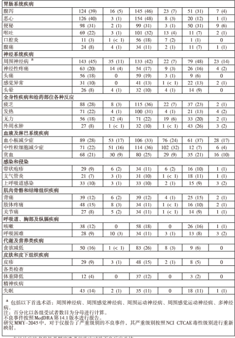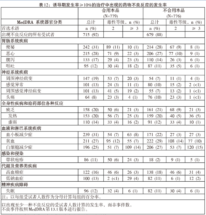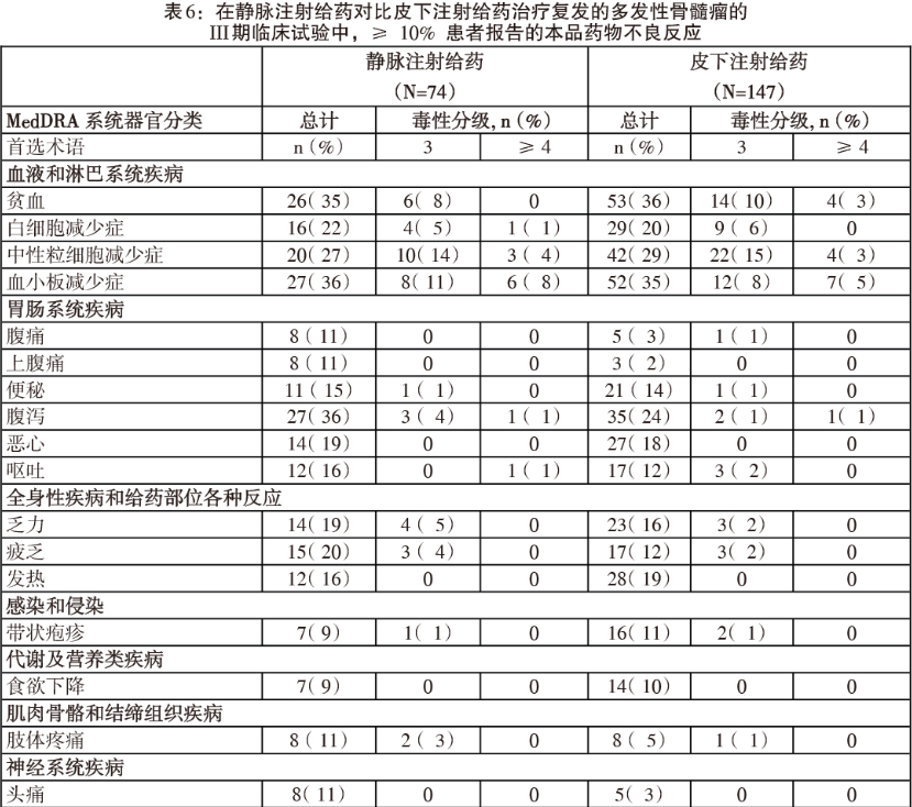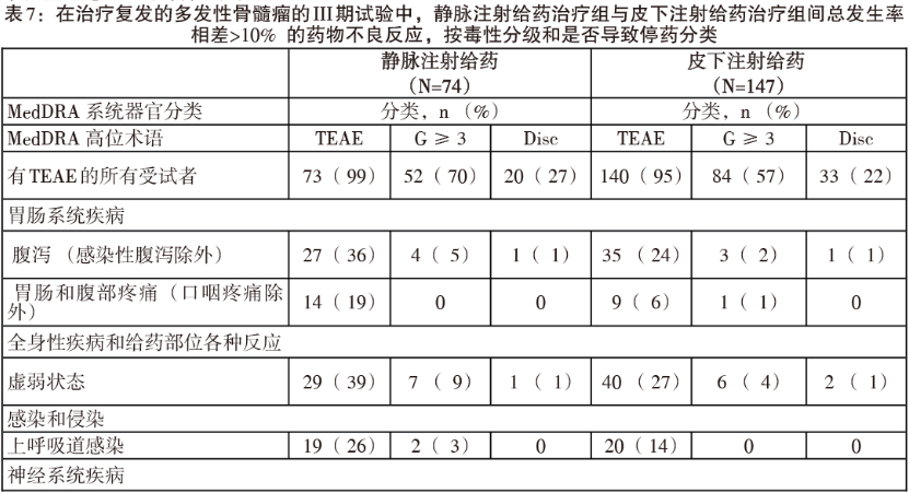 接受皮下给药的患者发生3级或以上毒性的治疗中出现的药物不良反应的总发生率比静脉给药组低13%(分别为57%对70%),导致停用本品的比例比静脉给药组低5%(22%对27%)。有关腹泻(皮下组为24% 对静注组为36%)、胃肠和腹部疼痛(皮下组为6% 对静注组为26%)以及周围神经病变(不另分类)(皮下组为38% 对静注组为53%)的总体发生率,皮下组比静注组低12%-15%。另外,3级及以上毒性的周围神经病变的发生率皮下组比静注组低10%(皮下组为6% 对静注组为16%),而且因周围神经病变而停药的比例皮下组(5%)比静注组(12%)低8%。