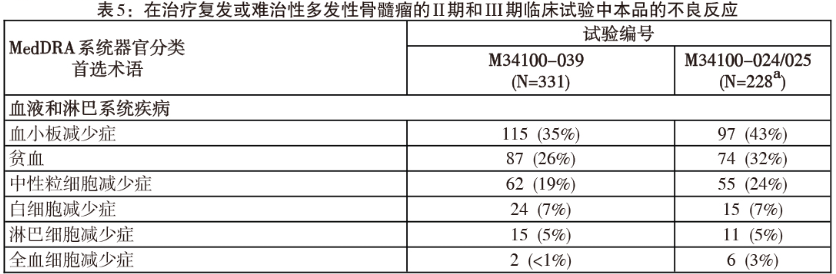 复发或难治性多发性骨髓瘤患者静脉注射给药的临床试验不良反应总结